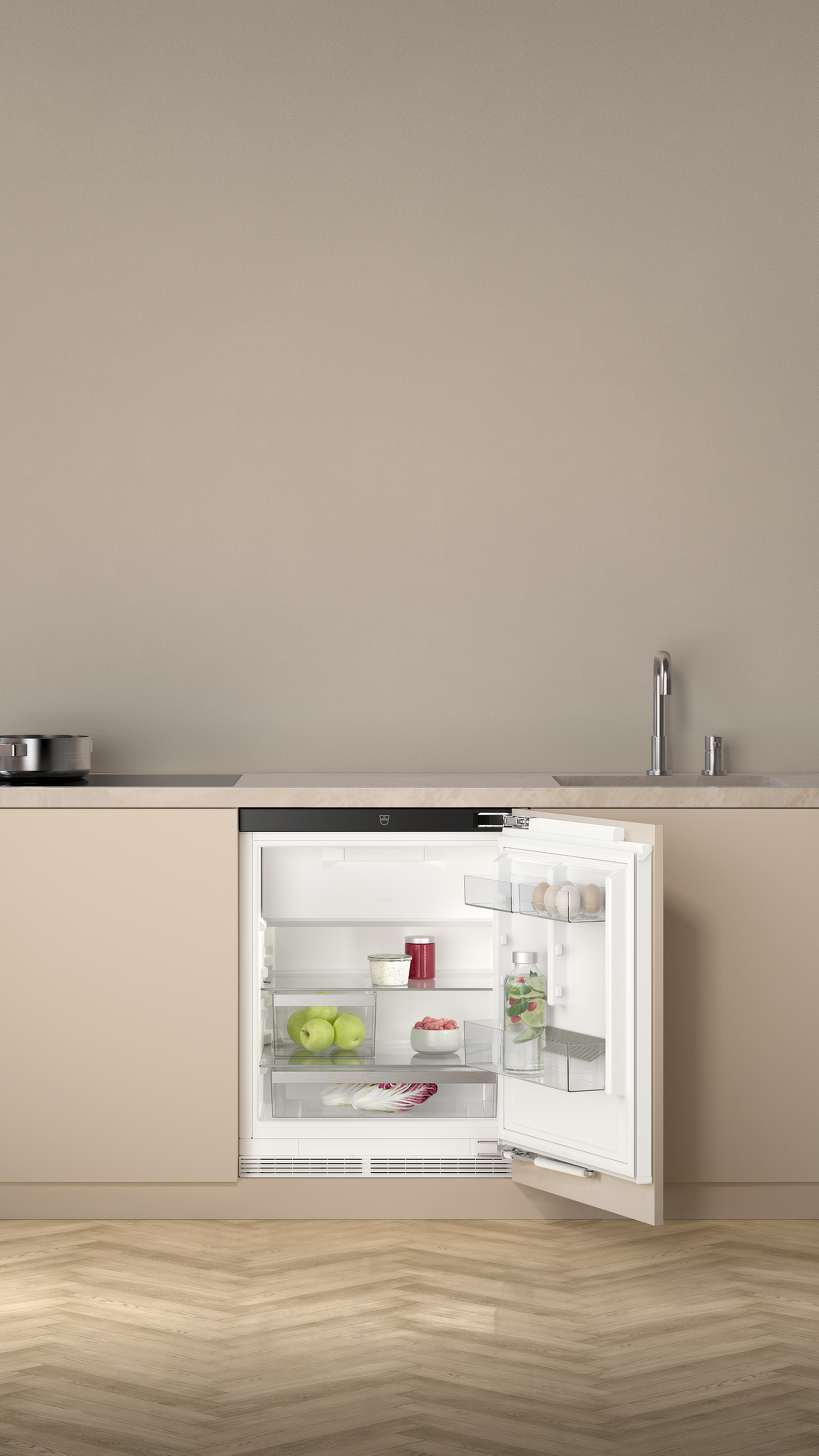 This space-efficient single-door fridge with integrated freezer compartment was designed for undercounter installation. Ideal for compact kitchens, it offers everyday convenience in a clean, streamlined design.