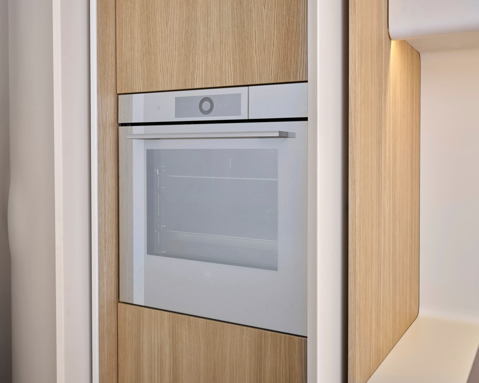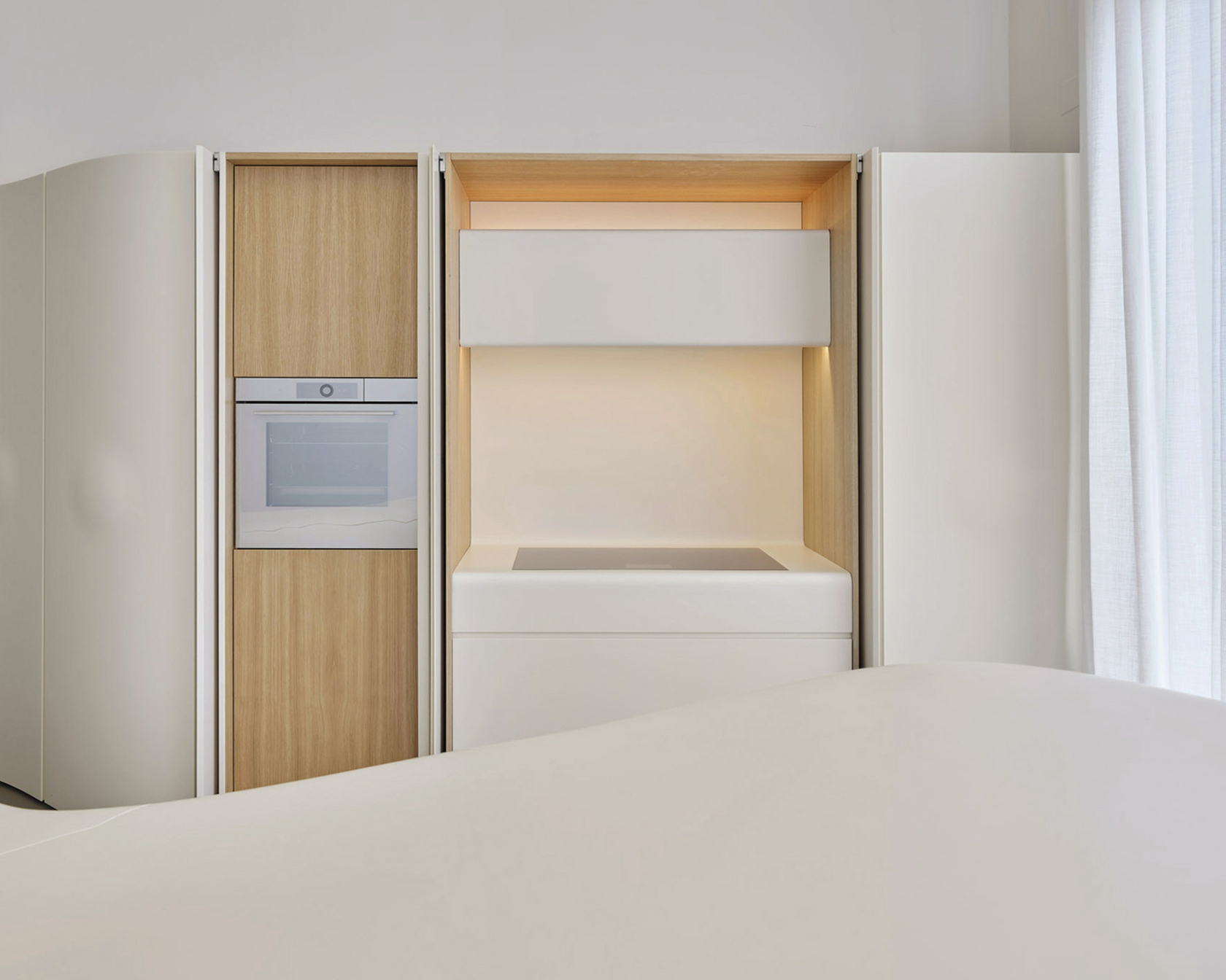 Claudio Silvestrin chose V-ZUG’s CookTop V6000 FullFlex and CombairSteamer V6000 in pearl to complement the ivory tones of etherea. The two colours establish a refined dialogue with the light wood cabinet surfaces, emphasising a sense of harmony and gentleness that pervades the space, inspired by the perfection of nature.
