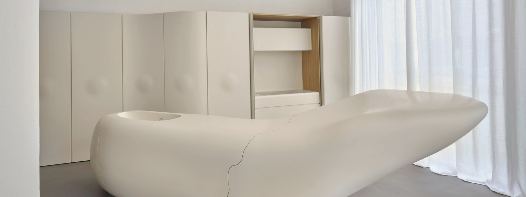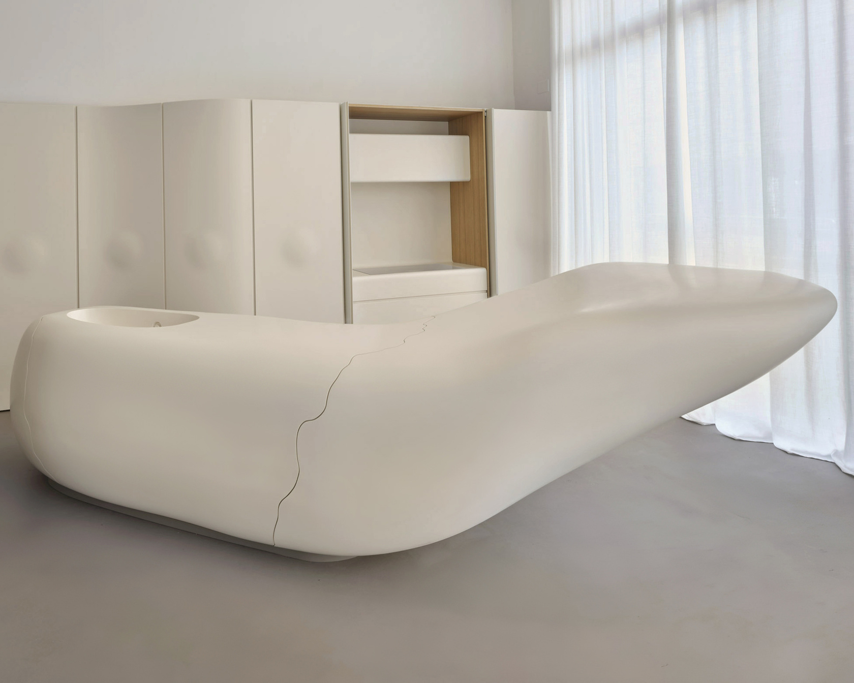 Etherea deliberately breaks away from the rigid man-made sharp corners and the machine-made look to embrace a sinuous form that appears like a stone or a sculpture suspended in the air, as its name suggests. The cupboard doors concealing the kitchen appliances feature rounded protrusions, designed to break up the flat monotony, typical of standard cabinetry. The traditional idea of the kitchen as a separate room vanishes, making way for an entirely new object — beautiful and innovative — that could just as easily be placed in the living room.