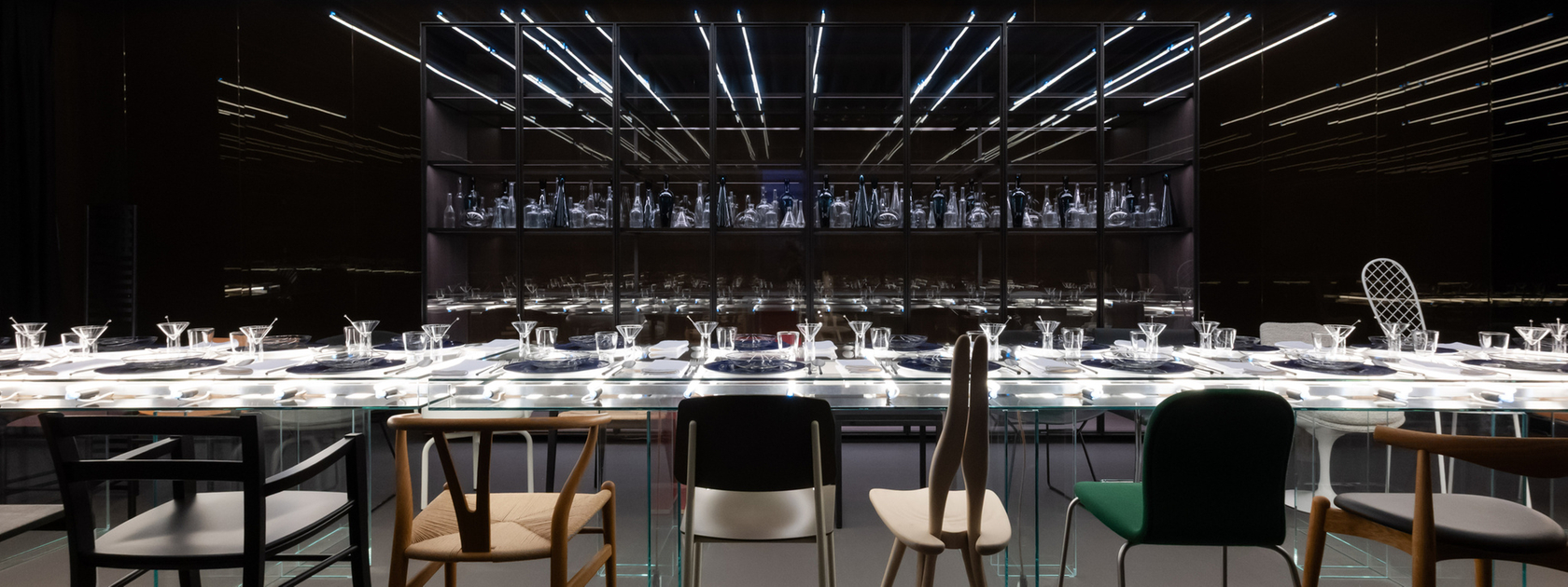 The restaurant displays and expands on the ritual of eating. I wanted it to be a stage for food — somewhat raw, even. A restaurant that denies decoration: glass tables, very cold neon lights, reflective walls, a Porro piece that is a glass cage, packed full of glass. I wanted to break away from the classic, gentle idea of decoration around food. Here, the food does the talking, amplified by the mirrors. Everything becomes infinite, forcing you to confront food in an almost monastic way.